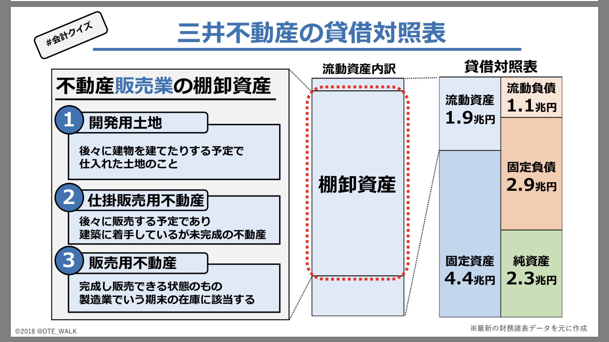 会計クイズ 大手町のランダムウォーカー على تويتر 会計クイズ ではまず不動産販売のウエイトが多いように思える三井不動産の貸借対照表です 通常 不動産は有形固定資産 に計上されるのですが 不動産販売業の場合 自社で扱っている商品が不動産なので 棚卸