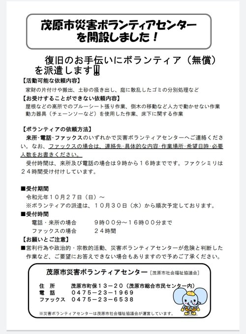 茂原市社会福祉協議会 ふくぞう On Twitter まもなく茂原市災害ボランティアセンターのボランティア受付を開始いたします 宜しくお願い致します