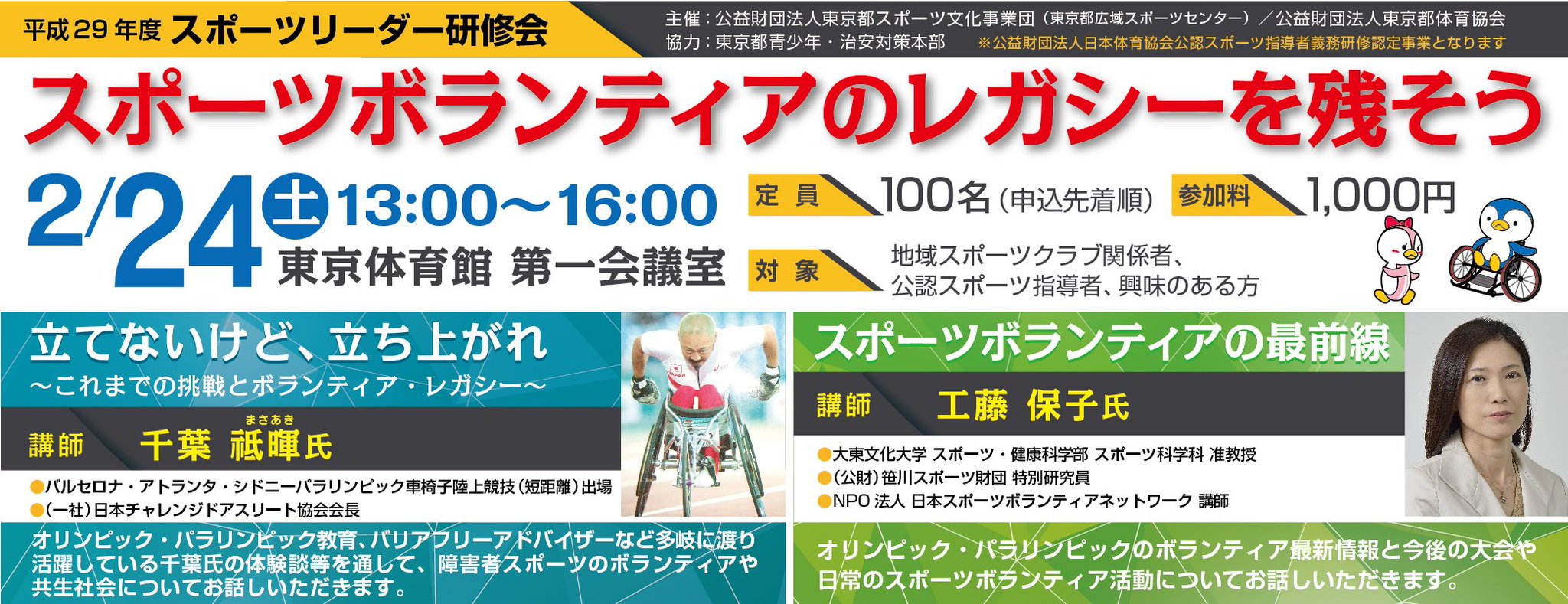 チッキー 東京都広域スポーツセンター V Twitter 2 24 土 スポーツリーダー研修会を開催します スポーツボランティア のレガシーを残そう をテーマに障害者スポーツのボランティアや共生社会について触れ 今後の大会や日常のスポーツボランティア活動について